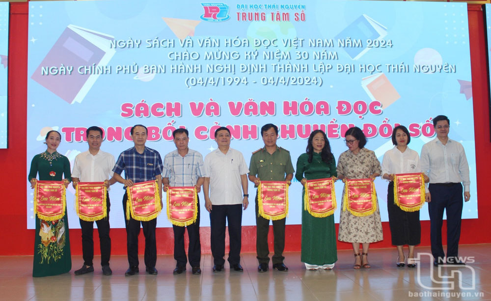 Lãnh đạo Đại học Thái Nguyên trao Cờ lưu niệm cho các đơn vị tham gia Tọa đàm chào mừng Ngày sách và Văn hóa đọc Việt Nam năm 2024.