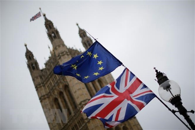 Cờ Anh (phía dưới) và cờ EU (phía trên) bên ngoài tòa nhà Quốc hội Anh ở thủ đô London. (Nguồn: THX/ TTXVN)