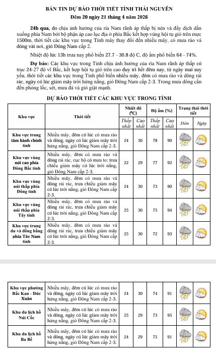 BẢN TIN DỰ BÁO THỜI TIẾT TỈNH THÁI NGUYÊN Đêm 20 ngày 21 tháng 4 năm 2026