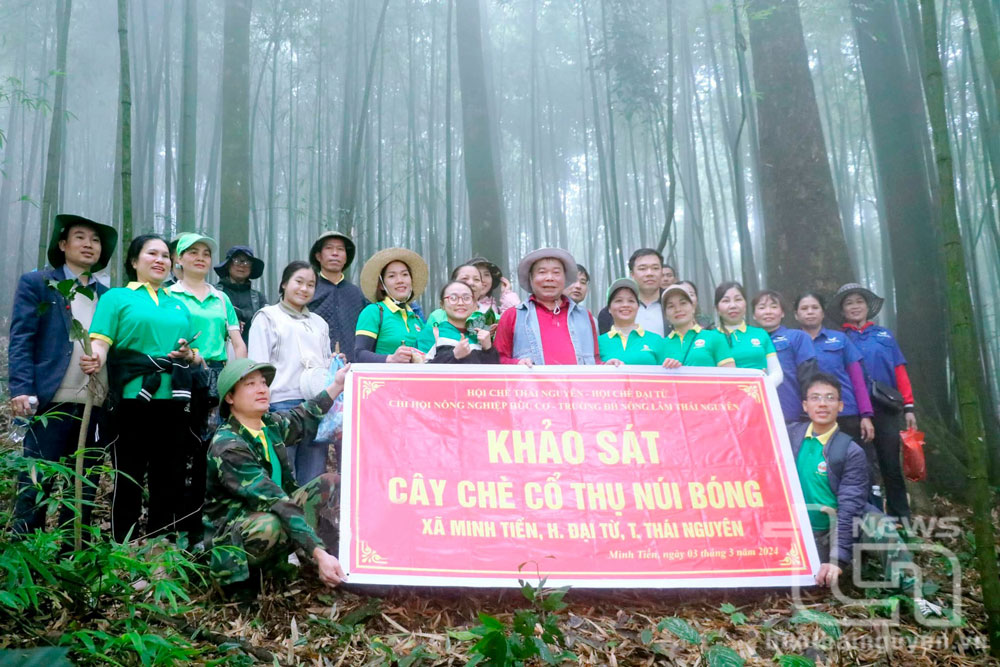 | Đoàn gồm các nhà khoa học và người yêu chè Thái Nguyên khảo sát cây chè cổ trên núi Bóng, xã Minh Tiến (Đại Từ) dịp tháng 3-2024. |