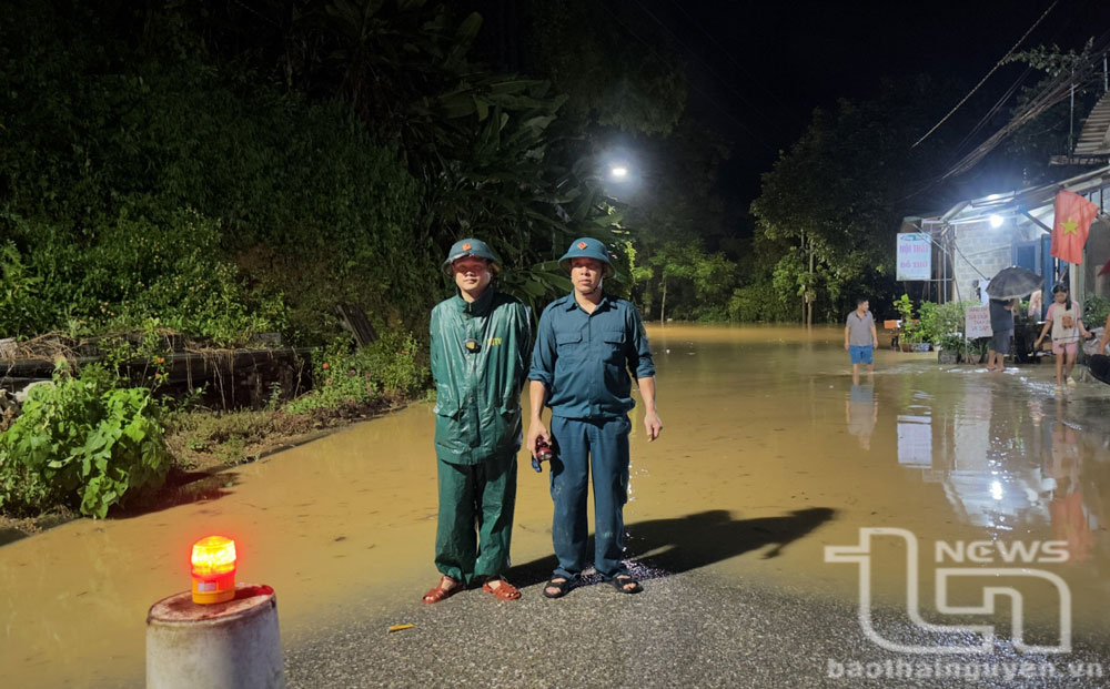 Lực lượng chức năng huyện Định Hóa trực, bảo đảm an toàn tại tuyến đường bị ngập sâu.