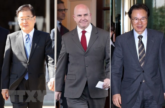 Giám đốc Văn phòng An ninh quốc gia của Phủ tổng thống Hàn Quốc, ông Chung Eui-yong (trái) và người đồng cấp Mỹ H.R. McMaster (giữa) và Nhật Bản Shotaro Yachi (phải). (Nguồn: Yonhap/TTXVN)