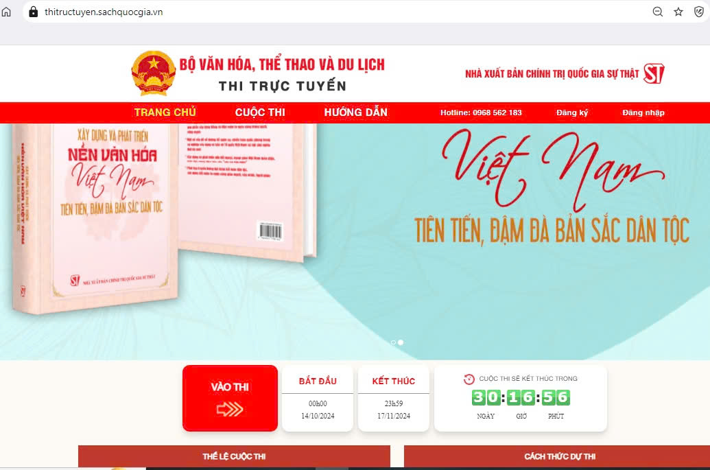 Cập nhật ngày: 19/10/2024 11:40 (Lượt xem: 8447)Cuộc thi được tổ chức từ ngày 14/10/2024 đến hết ngày 17/11/2024 trên Cổng Thông tin điện tử của Bộ Văn hóa, Thể thao và Du lịch tại địa chỉ https://thitructuyen.sachquocgia.vn. Tất cả cán bộ, đảng viên, công chức, viên chức và Nhân dân đều được tham gia dự thi. Cuộc thi được tổ chức thành 05 tuần thi, cụ thể: