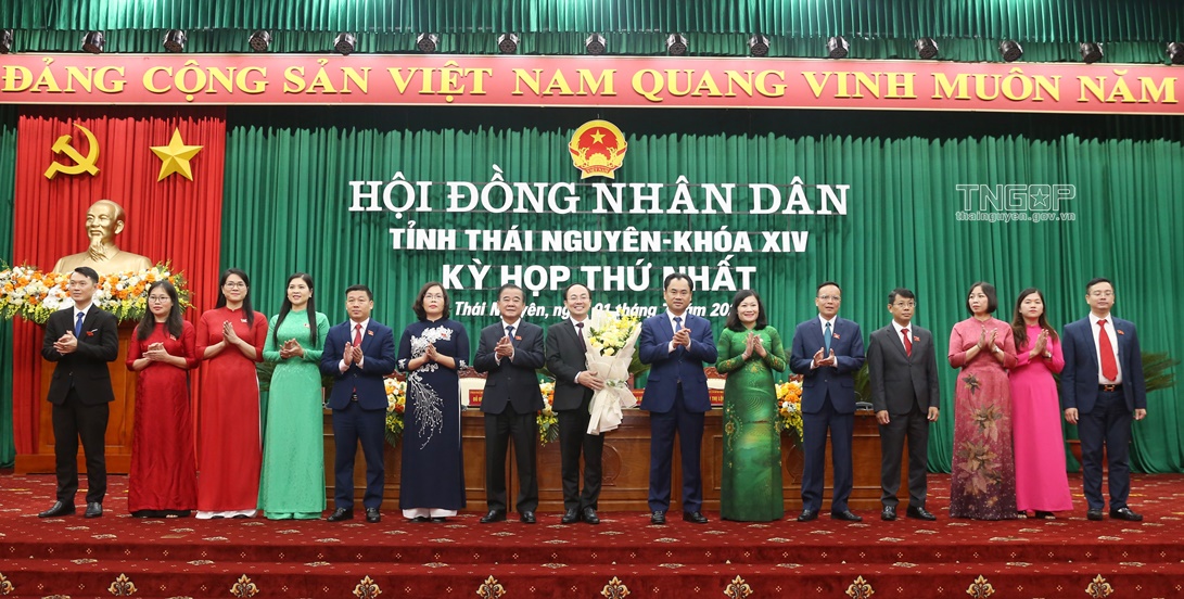 Đồng chí Bí thư Tỉnh ủy Trịnh Việt Hùng tặng hoa chúc mừng đồng chí Chủ tịch, các đồng chí Phó Chủ tịch, Trưởng các Ban của HĐND tỉnh Thái Nguyên
