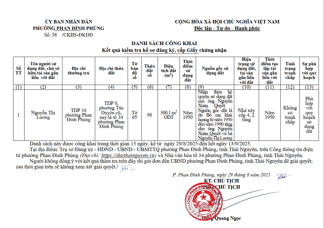 Danh sách công khai kết quả kiểm tra hồ sơ đăng ký, cấp Giấy chứng nhận (Nguyễn Thị Đăng)