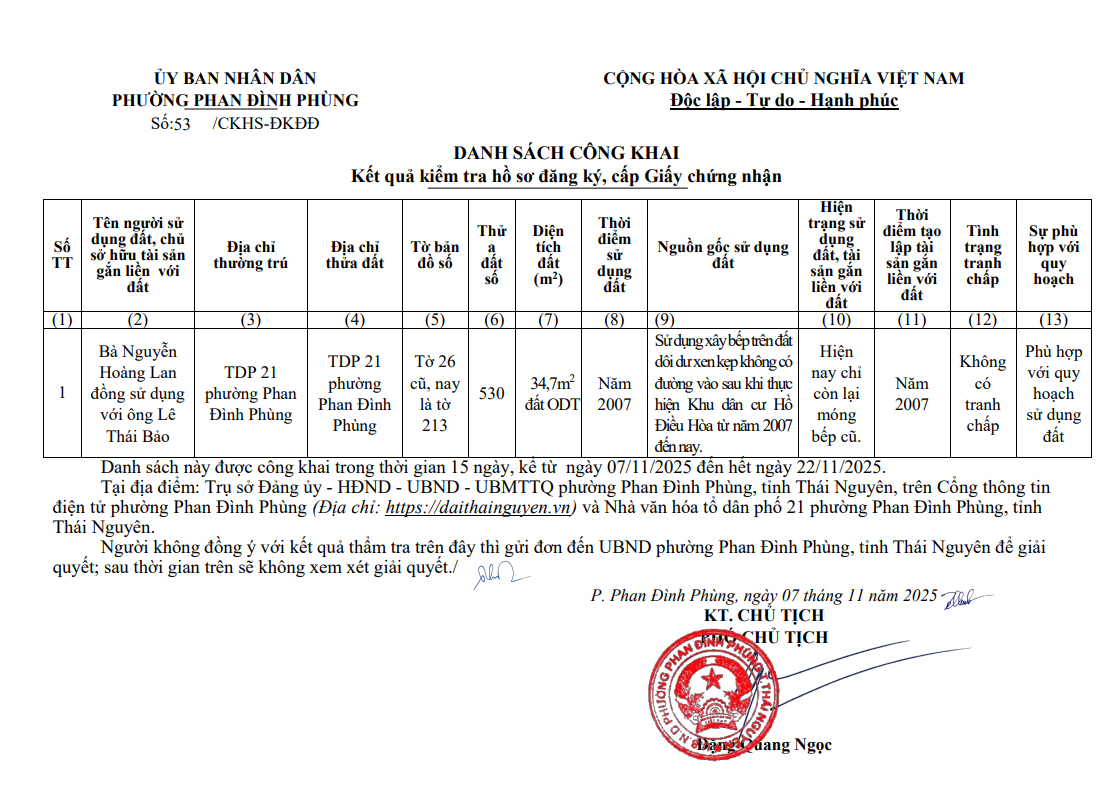 Thông báo về việc công khai bản mô tả ranh giới, mốc giới thửa đất ông Vũ Ngọc Tuấn