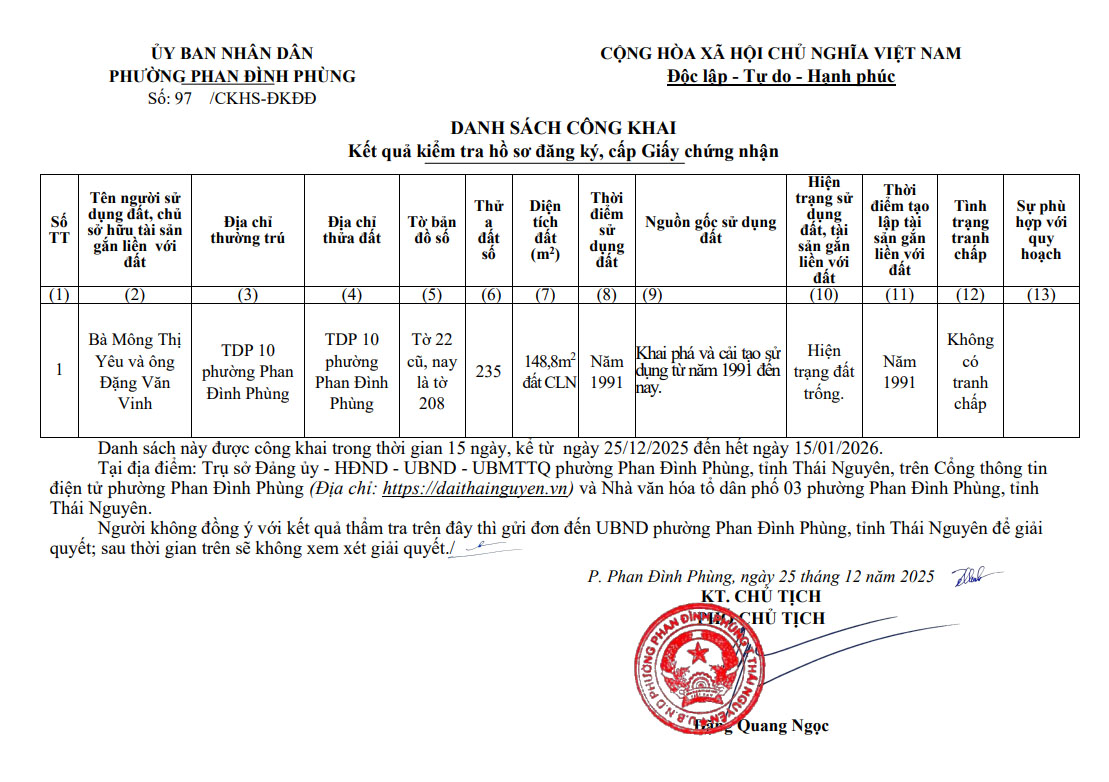 Danh sách công khai Kết quả kiểm tra hồ sơ đăng ký, cấp Giấy chứng nhận (Bà Mông Thị Yêu và Ông Đặng Văn Vinh)