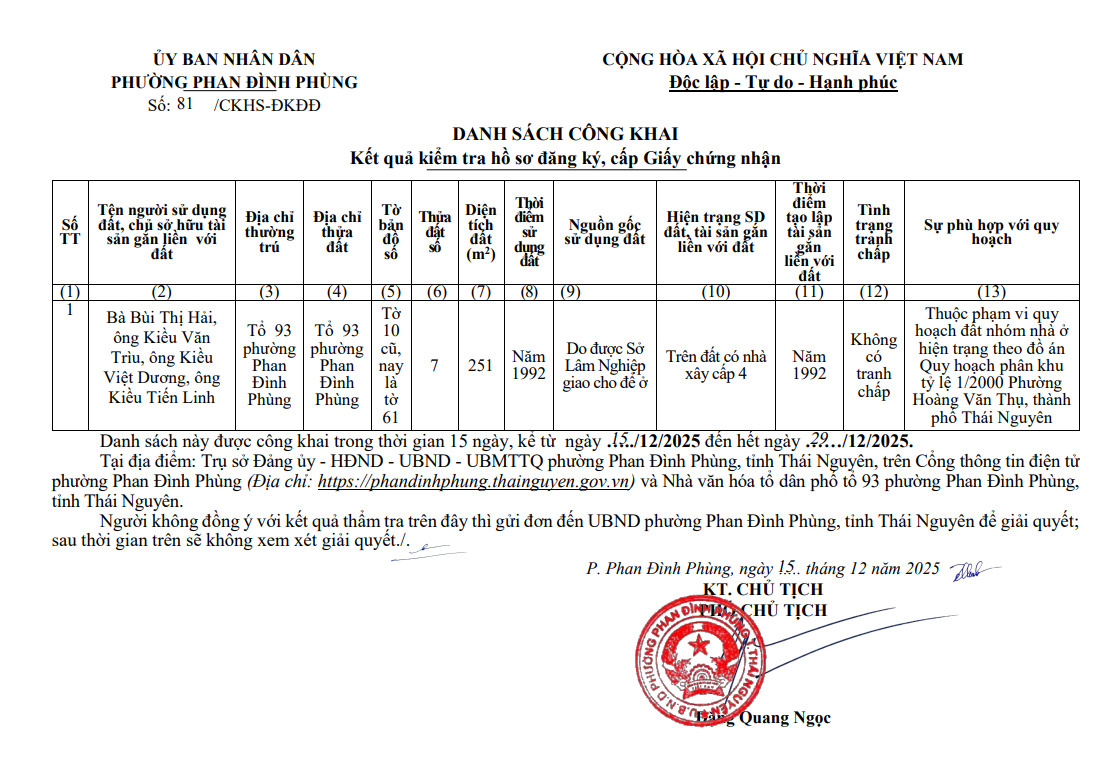 DANH SÁCH CÔNG KHAI Kết quả kiểm tra hồ sơ đăng ký, cấp Giấy chứng nhận hộ ông Ngô Xuân Hồng
