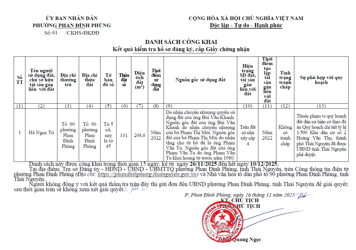 DANH SÁCH CÔNG KHAI Kết quả kiểm tra hồ sơ đăng ký, cấp Giấy chứng nhận Hà Ngọc Tú