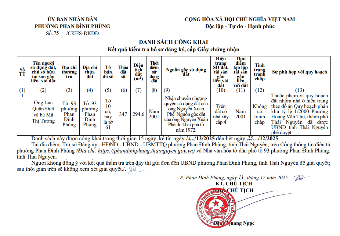 DANH SÁCH CÔNG KHAI Kết quả kiểm tra hồ sơ đăng ký, cấp Giấy chứng nhận hộ ông Ngô Xuân Hồng