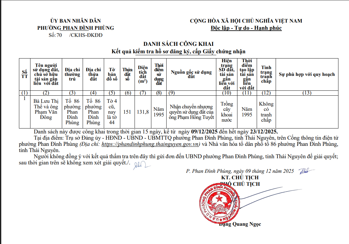 DANH SÁCH CÔNG KHAI Kết quả kiểm tra hồ sơ đăng ký, cấp Giấy chứng nhận hộ ông Ngô Xuân Hồng