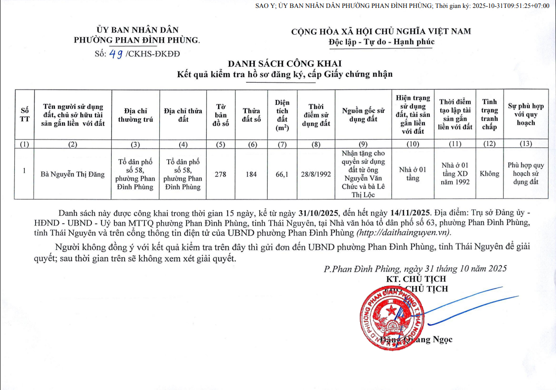 Danh sách công khai kết quả kiểm tra hồ sơ đăng ký, cấp Giấy chứng nhận (Nguyễn Thị Đăng)