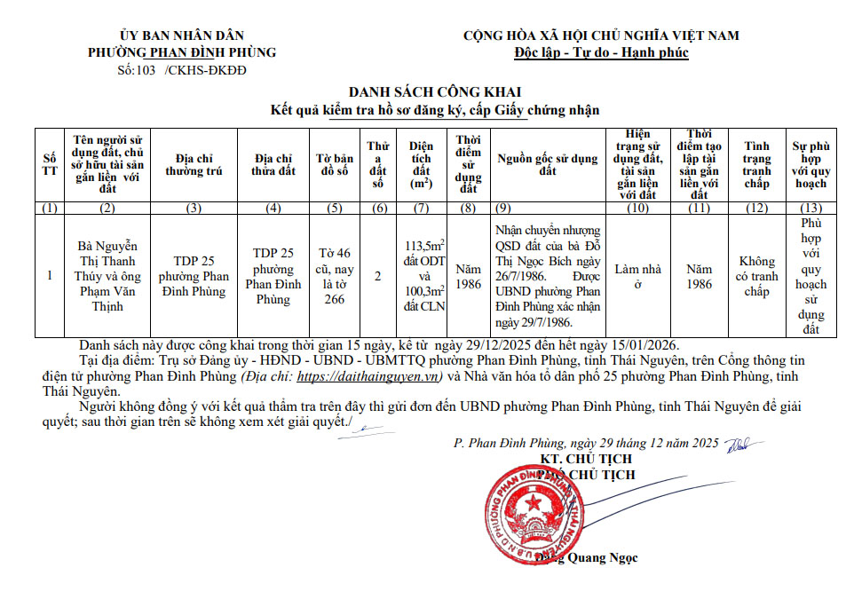 Danh sách Kết quả kiểm tra hồ sơ đăng ký, cấp Giấy chứng nhận Nguyễn Thị Thanh Thúy