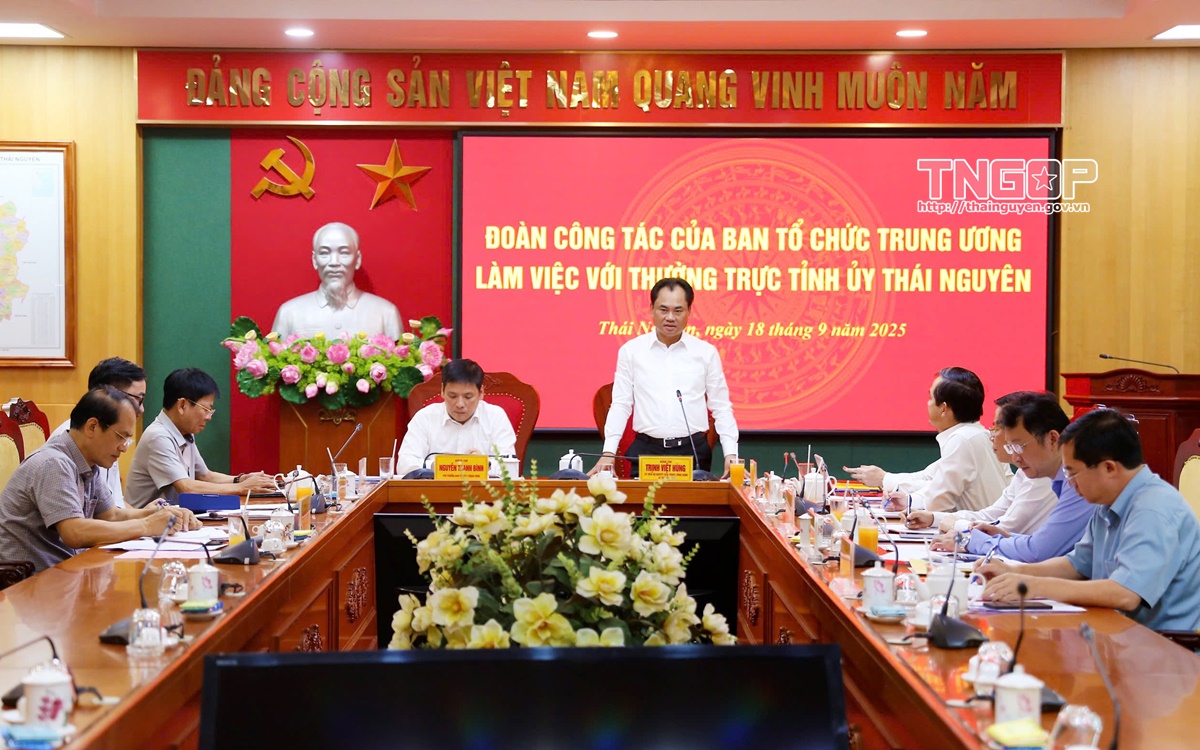 Tại chương trình làm việc, lãnh đạo tỉnh Thái Nguyên đã thông tin tới Đoàn công tác về tình hình phát triển kinh tế - xã hội của tỉnh; công tác xây dựng Đảng gắn với mô hình chính quyền địa phương 2 cấp. Đảng bộ tỉnh Thái Nguyên hiện có 96 đảng bộ trực thuộc Tỉnh ủy, 40 đảng bộ bộ phận, 5.697 chi bộ trực thuộc với 140.108 đảng viên. Từ ngày 01/7/2025 đến nay, tỉnh đã tổ chức 22 hội nghị Thường trực Tỉnh ủy; 10 hội nghị Ban Thường vụ Tỉnh ủy, 6 hội nghị Ban Chấp hành Đảng bộ tỉnh; 5 kỳ họp HĐND tỉnh và 5 phiên họp UBND tỉnh để cho ý kiến và quyết định các nội dung thuộc thẩm quyền; nghiêm túc thực hiện việc quán triệt, triển khai, cụ thể hóa các văn bản chỉ đạo, hướng dẫn của Ban Chấp hành Trung ương, Bộ Chính trị, Ban Bí thư, Ban Chỉ đạo Trung ương về tiếp tục hoàn thiện tổ chức bộ máy của hệ thống chính trị và chuẩn bị đại hội đảng các cấp.