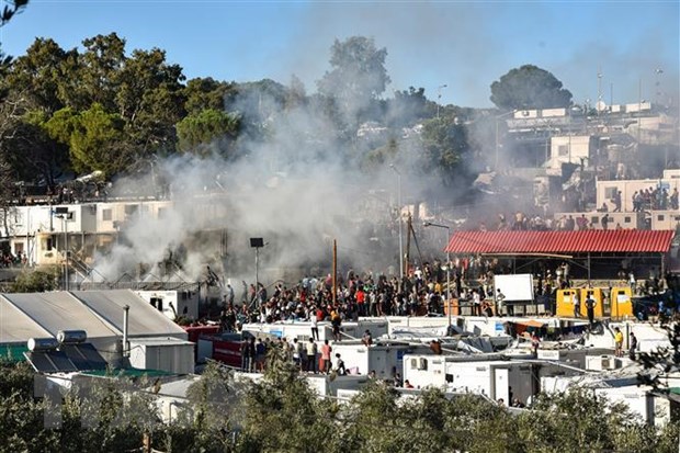 Người di cư cố gắng thoát thân sau vụ hỏa hoạn tại trại tị nạn Moria trên đảo Lebos, Hy Lạp ngày 29/9/2019. (Nguồn: AFP/TTXVN)