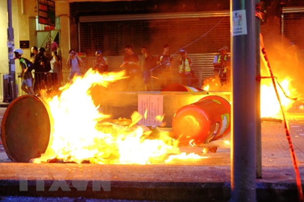 Người biểu tình đốt phá trên đường phố tại Hong Kong. (Ảnh: THX/ TTXVN)