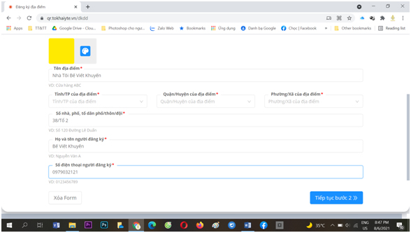 Bước 2: Chọn mầu sắc và nhập thông tin địa điểm bao gồm: Tên địa điểm, Tỉnh/Thành phố của địa điểm, quận/huyện của địa điểm, Phường xã của địa điểm; Họ tên người đăng ký; số điện thoại đăng ký.(Lưu ý một số điện thoại có thể quản lý nhiều địa điểm, một địa điểm có thể được quản lý bởi nhiều người). Sau đó ấn “tiếp tục bước 2”