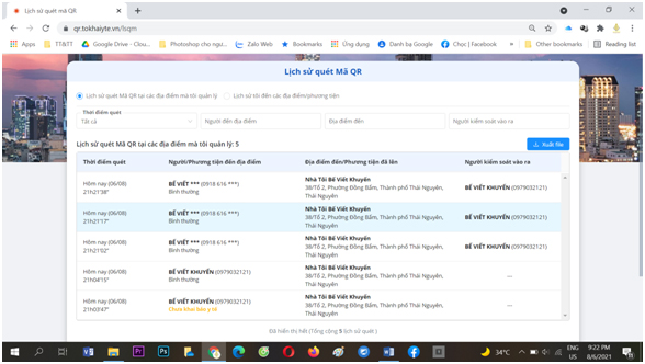 - phần 1: lịch sử quét mã QR địa điểm tôi quản lý: chính là lịch sử người ra vào địa điểm.