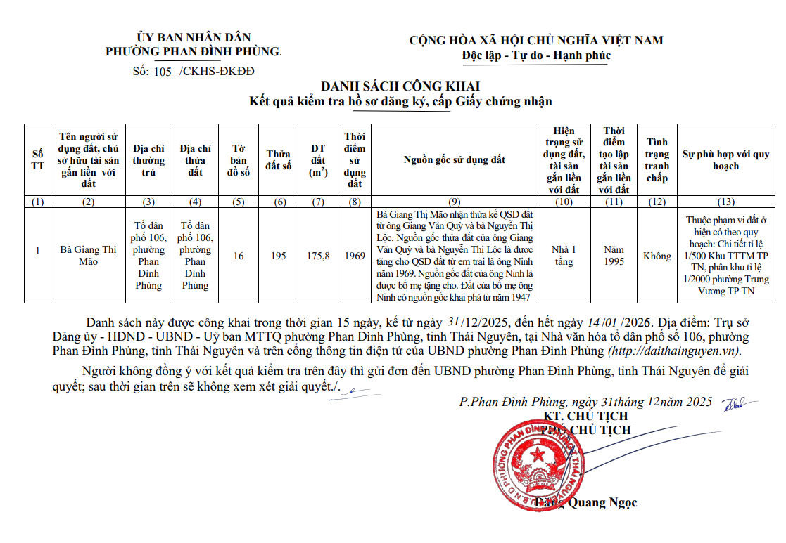 Thông báo về việc công khai bản mô tả ranh giới, mốc giới thửa đất ông Vũ Ngọc Tuấn