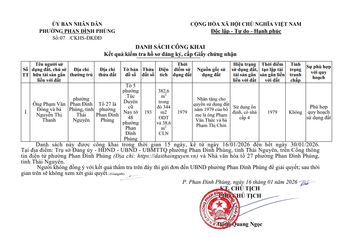 Thông báo về việc công khai bản mô tả ranh giới, mốc giới thửa đất ông Vũ Ngọc Tuấn