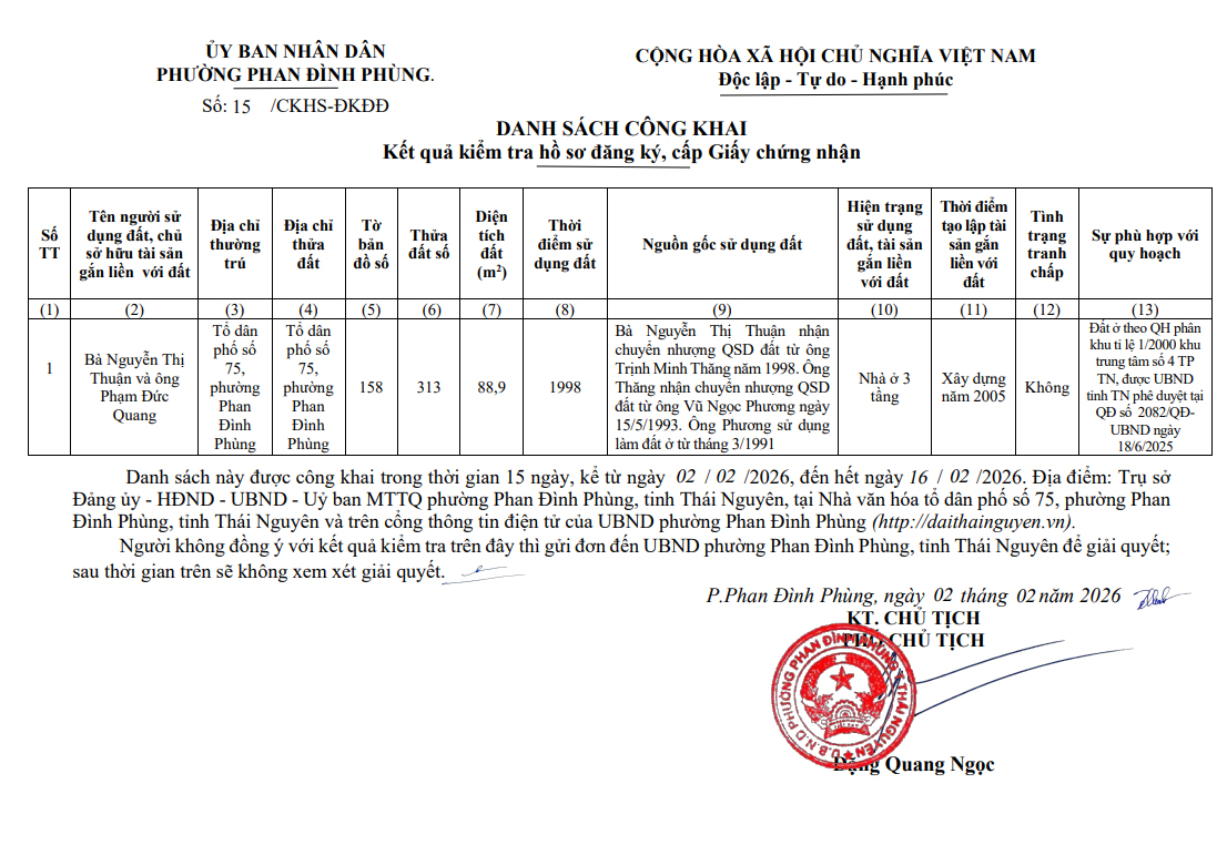 THÔNG BÁO Công khai về việc làm thủ tục cấp Giấy chứng nhận quyền sử dụng đất, quyền sở hữu tài sản gắn liền với đất của ông Mông Đình Thắng