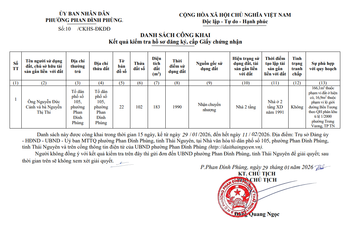 Kết quả kiểm tra hồ sơ đăng ký, cấp Giấy chứng nhận Nguyễn Đức Cảnh