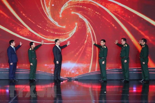 Các đại biểu thực hiện nghi thức khai trương Cơ sở Dữ liệu Văn bản Pháp luật về Quân sự, Quốc phòng. (Ảnh: An Đăng/TTXVN)