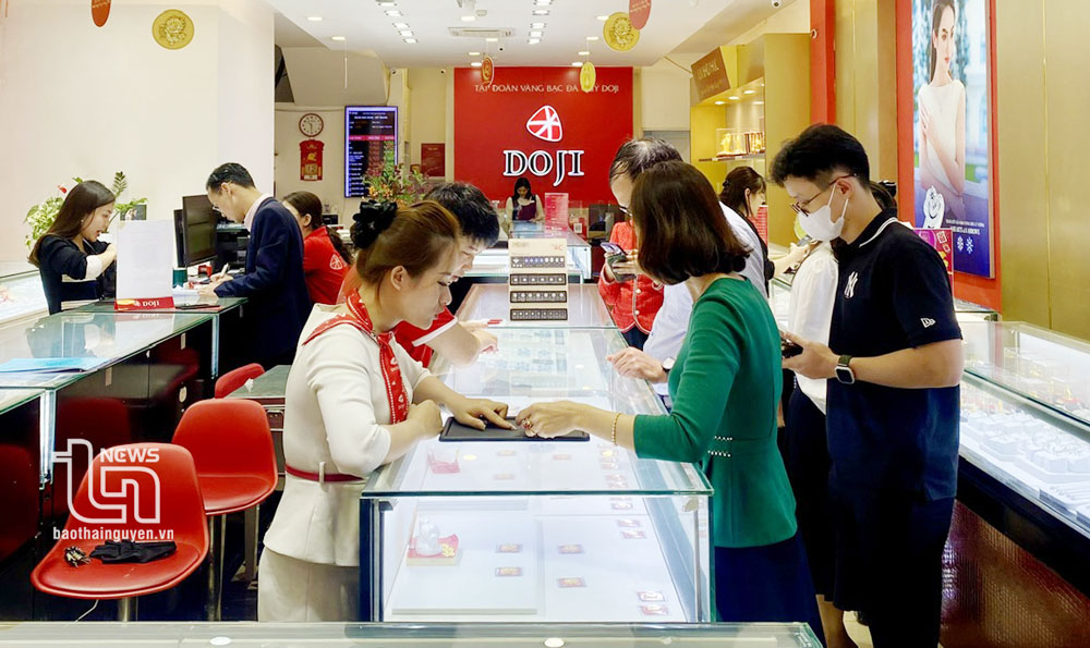Người dân mua vàng tại cửa hàng vàng Doji Thái Nguyên.