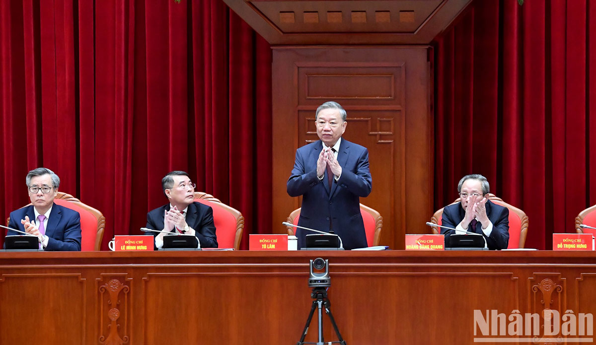 Về nhiệm vụ trọng tâm năm 2025, Tổng Bí thư nhấn mạnh đây là năm diễn ra nhiều sự kiện trọng đại của Đảng, đặc biệt là đại hội đảng bộ các cấp tiến tới Đại hội Đảng toàn quốc lần thứ XIV. Đồng chí đề nghị người đứng đầu cấp ủy, tổ chức phải luôn trăn trở, tìm giải pháp, trả lời cho các câu hỏi: Làm sao để bộ máy tinh gọn nhưng phải hoạt động hiệu năng, hiệu lực, hiệu quả, phù hợp với thực tiễn; xây dựng đội ngũ cán bộ có năng lực, tâm huyết, trách nhiệm, sẵn sàng cống hiến, phục vụ Đảng, Nhà nước, nhân dân; phải xác định cán bộ là khâu then chốt, đột phá…