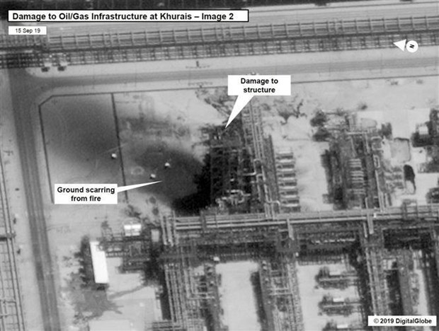 (Hình ảnh từ vệ tinh của Chính phủ Mỹ): Những thiệt hại về cơ sở hạ tầng của nhà máy lọc dầu Khurais thuộc Tập đoàn Aramco sau các vụ tấn công bằng máy bay không người lái ở Saudi Arabia ngày 15/9/2019. (Ảnh: AFP/TTXVN)
