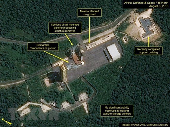 Các hoạt động tháo dỡ tại bãi thử tên lửa Sohae của Triều Tiên. (Ảnh: Yonhap/TTXVN)