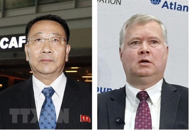 Đại diện đặc biệt của Mỹ về Triều Tiên Stephen Biegun (phải) và Trưởng đoàn đàm phán Triều Tiên Kim Myong-gil (trái). (Ảnh: Kyodo/TTXVN)