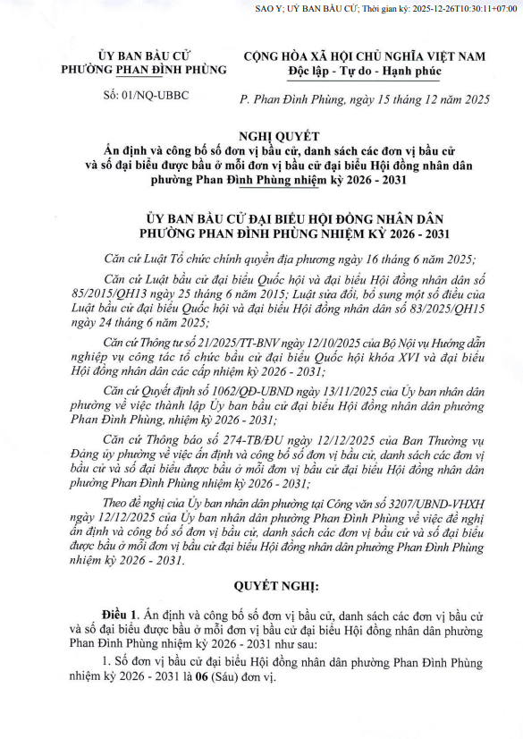 NGHỊ QUYÉT Ấn định và công bố số đơn vị bầu cử, danh sách các đơn vị bầu cử và số đại biểu được bầu ở mỗi đơn vị bầu cử đại biểu Hội đồng nhân dân phường Phan Đình Phùng nhiệm kỳ 2026 - 2031