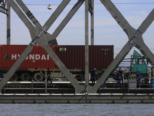 Xe chở hàng hóa đi qua cây cầu nối hữu nghị nối Trung Quốc - Triều Tiên ngày 23/10/2006. (Nguồn: AFP/TTXVN)