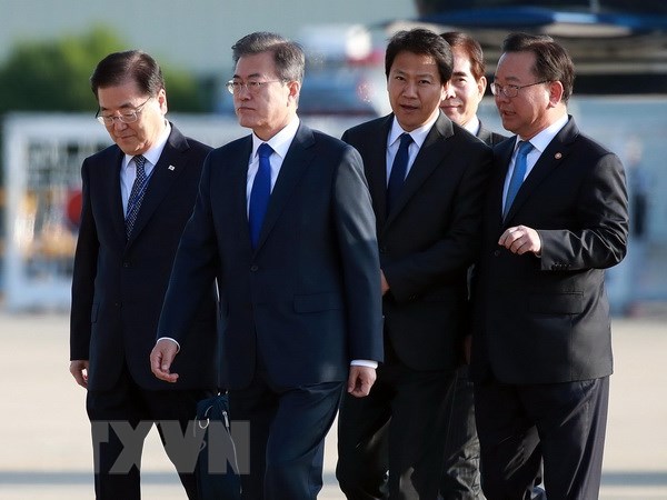 Tổng thống Hàn Quốc Moon Jae-in (thứ 2, trái) tại sân bay Seoul ở Seongnam, chuẩn bị khởi hành tới Nhật Bản ngày 9/5. (Nguồn: YONHAP/ TTXVN)