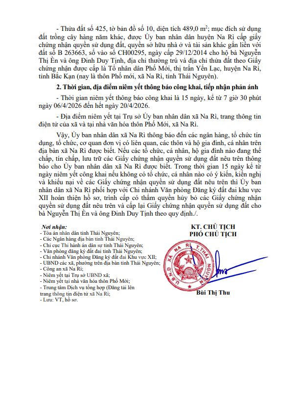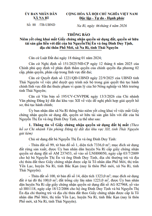 Niêm yết công khai mất Giấy chứng nhận quyền sử dụng đất, quyền sở hữu tài sản gắn liền với đất của bà NguyễnThị Èn và ông Đinh Duy Tịnh, địa chỉ thôn Phố Mới, xã Na Rì, tỉnh Thái Nguyên.