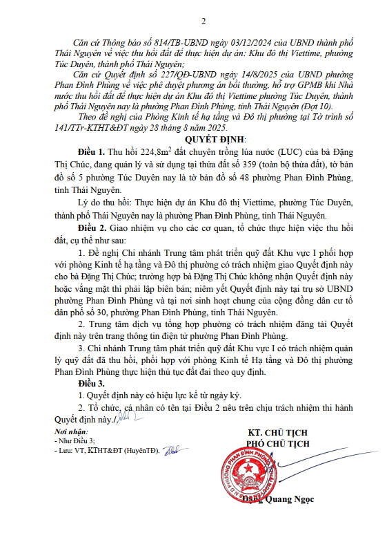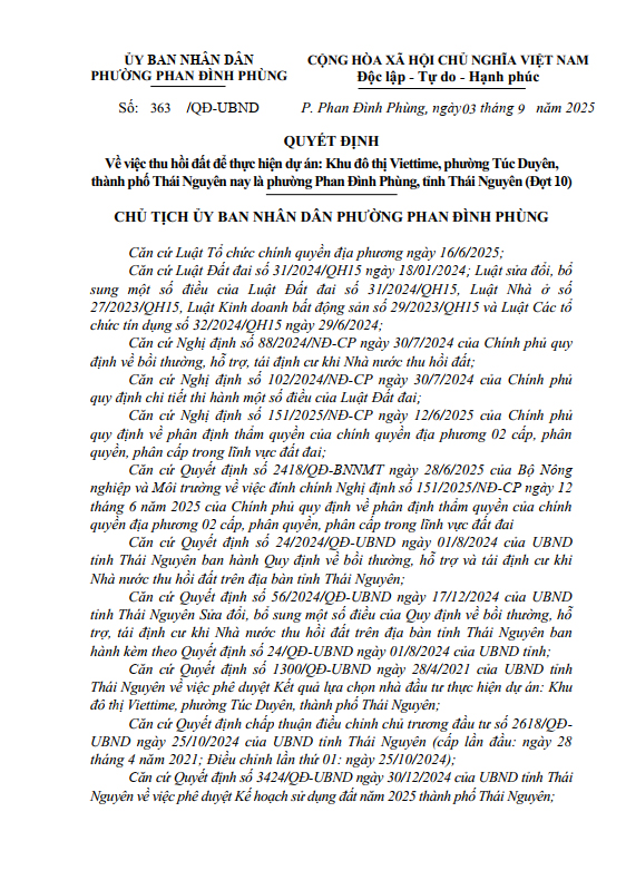 Quyết định về việc thu hồi đất để thực hiện dự án: Khu đô thị Viettime, phường Túc Duyên thành phố Thái Nguyên nay là phường Phan Đình Phùng, tỉnh Thái Nguyên