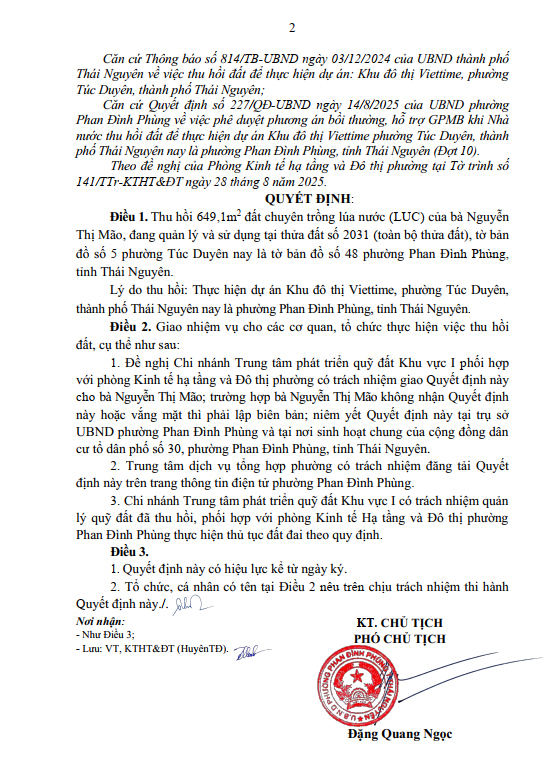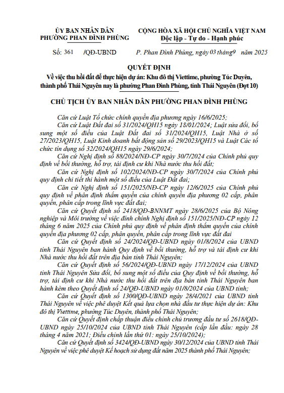 Quyết định về việc thu hồi đất để thực hiện dự án: Khu đô thị Viettime, phường Túc Duyên thành phố Thái Nguyên nay là phường Phan Đình Phùng, tỉnh Thái Nguyên (đợt 10)