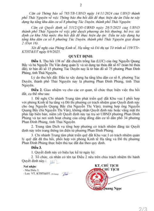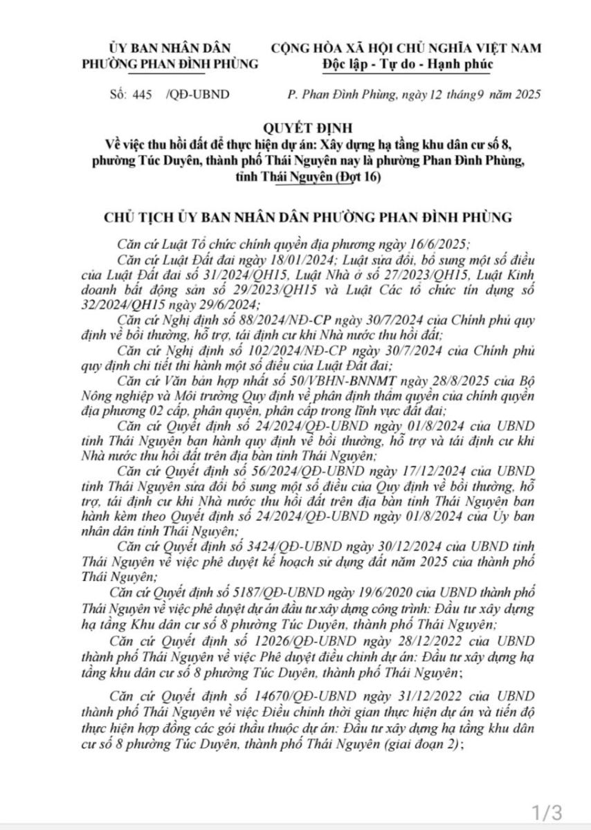 QUYẾT ĐỊNH Về việc thu hồi đất để thực hiện dự án: Xây dựng hạ tầng khu dân cư số 8, phường Túc Duyên, thành phố Thái Nguyên nay là phường Phan Đình Phùng, tỉnh Thái Nguyên (Đợt 16)