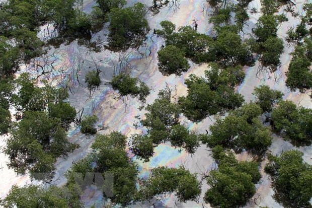 Vệt dầu loang do 60.000 tấn dầu bị tràn ra Vịnh Guanabara thuộc thành phố Rio de Janeiro, Brazil. (Ảnh: AFP/TTXVN)
