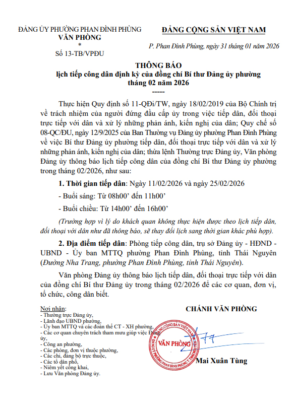 Thông báo lịch tiếp công dân định kỳ của Đồng chí Bí thư Đảng ủy phường tháng 02 năm 2026
