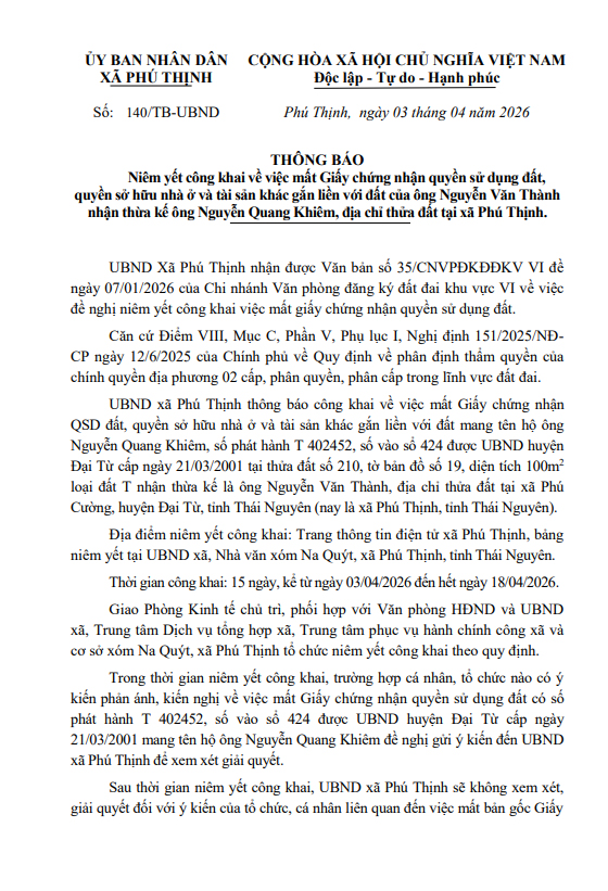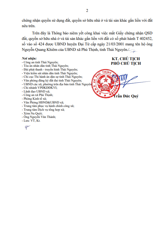 Thông báo niêm yết mất GCNQSD đất ông Nguyễn Quang Khiêm