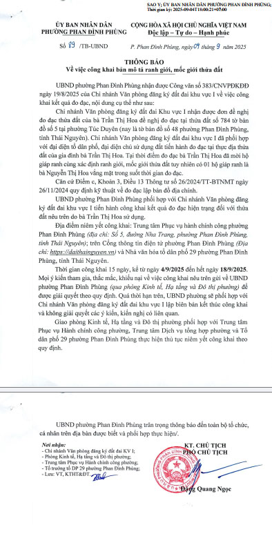 THÔNG BÁO về việc công khai bản mô tả ranh giới, mốc giới thửa đất