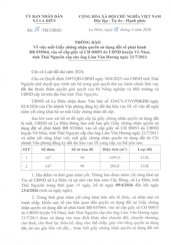 Thông báo về việc mất giấy chứng nhận QSDĐ có số phát hành BB 03564, vào sổ cấp giấy số CH 00053 do UBND huyện Võ Nhai, tỉnh Thái Nguyên cấp cho ông Lâm Văn Hương ngày 21/7/2011