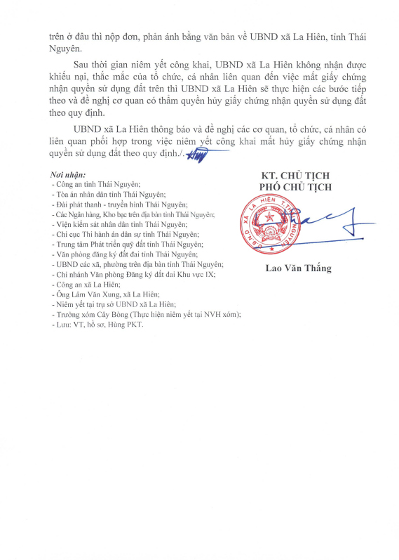 Thông báo niêm yết mất GCNQSD đất ông Nguyễn Quang Khiêm