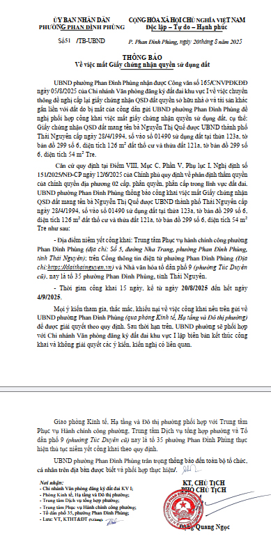 Thông báo Về việc mất Giấy chứng nhận quyền sử dụng đất