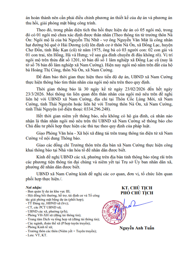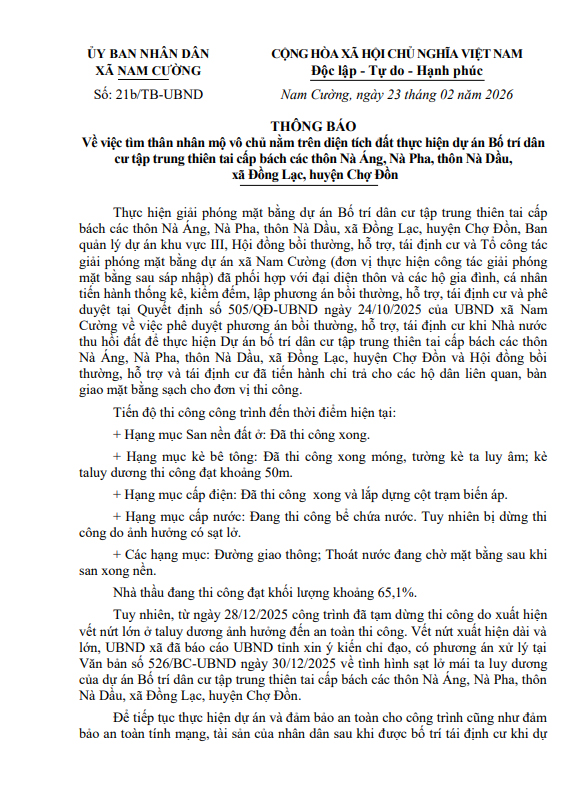 THÔNG BÁO Về việc tìm thân nhân mộ vô chủ nằm trên diện tích đất thực hiện dự án Bố trí dân cư tập trung thiên tai cấp bách các thôn Nà Áng, Nà Pha, thôn Nà Dầu, xã Đồng Lạc, huyện Chợ Đồn