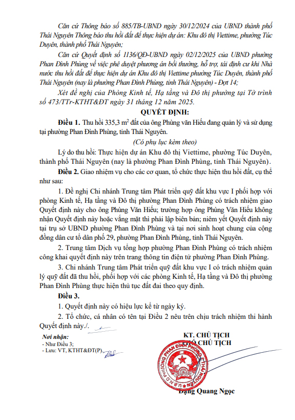 Thu hồi đất để thực hiện Dự án Khu đô thị Viettime, phường Túc Duyên, thành phố Thái Nguyên (nay là phường Phan Đình Phùng, tỉnh Thái Nguyên)(Phùng Văn Hiếu)