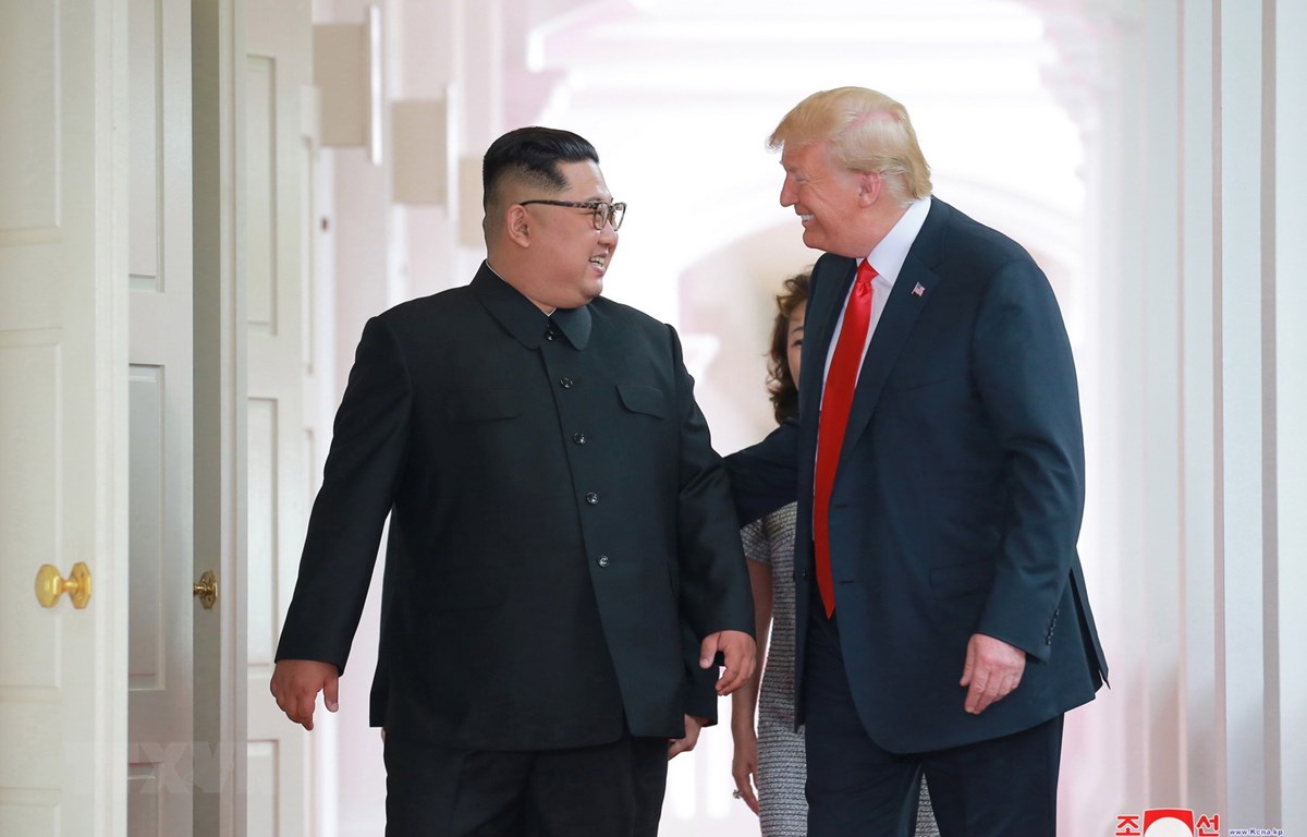 Trong ảnh (do Hãng thông tấn Trung ương Triều Tiên đăng phát): Nhà lãnh đạo Triều Tiên Kim Jong-un (trái) trong cuộc gặp thượng đỉnh với Tổng thống Mỹ Donald Trump tại Singapore ngày 12/6/2018. (Nguồn: EPA/TTXVN)