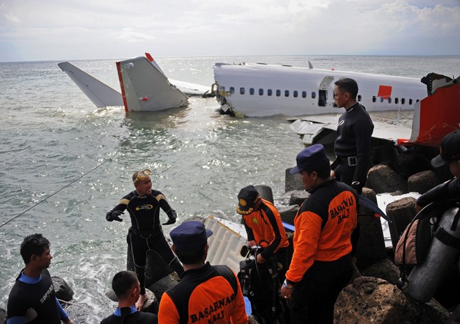 Lực lượng cứu hộ làm nhiệm vụ tại hiện trường một vụ rơi máy bay Boing 737 của Hãng hàng không Lion Air ở gần Denpasar, Indonesia ngày 14/5/2013. (Ảnh: AFP/TTXVN)